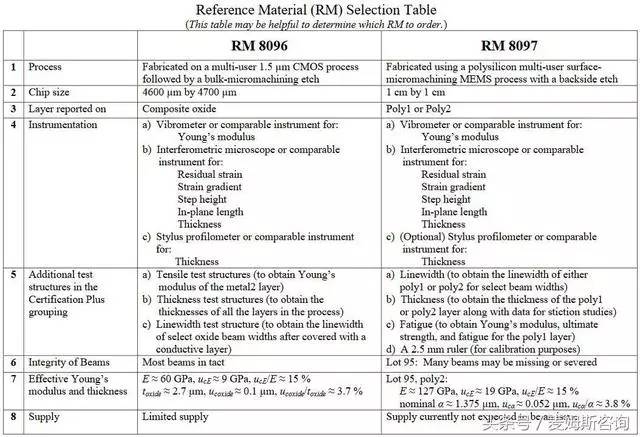 “8个技术特性”是标准物质证书中具有代表性的典型参数,即前文叙述中提到的五种加上以下三种:残余应力、应力梯度、横梁厚度。残余应力和应力梯度是通过杨氏模量测试方法计算得到的;横梁厚度特性是利用RM8096通过基于电物理技术、加上RM8097通过光机械技术,应用台阶高度测量方法获得的(在NIST特刊SP260—177中提及)。因此,五种测试方法可以用于获得8个技术特性参数。