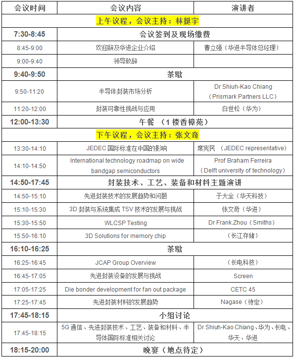 国际先进封装产业化技术论坛暨华进开放日活动,以产业发展研究、市场报告及技术交流为主要内容,邀请相关政府领导、国内外知名学者、国内外半导体行业著名企业的高层,报告产业发展研究成果,探讨市场走势,交流企业发展经验,展示新技术、新产品开发成果,从产业政策、终端系统需求、封装设计及工艺、设备与材料等向与会人员展示最新技术前景,预测产业化发展趋势。