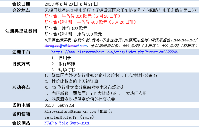 2018年度盛会NCAP & Yole先进封装及系统集成专题研讨会开始报名啦!