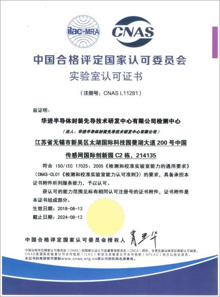 经过一年多的精心筹备,华进半导体封装先导技术研发中心有限公司检测中心(下文简称“华进检测中心”)于2018年8月13日通过中国合格评定国家认可委员会(CNAS: China National Accreditation Service for Conformity Assessment)的现场评审,获得国家实验室认可资质。