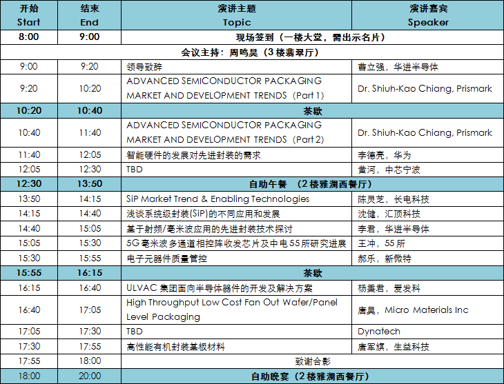 本次会议以产业链的热门话题及技术为主题,围绕5G/AI应用、晶圆级系统集成及高密度先进封装、先进封装材料及设备等主题展开,以市场报告及技术交流为主要内容,邀请知名半导体企业的技术专家和高级管理人员,展示行业最新技术,探讨产业发展趋势,交流企业发展经验。本次活动还设有茶歇、自助午餐及晚宴,为大家提供一个轻松舒适的社交环境。