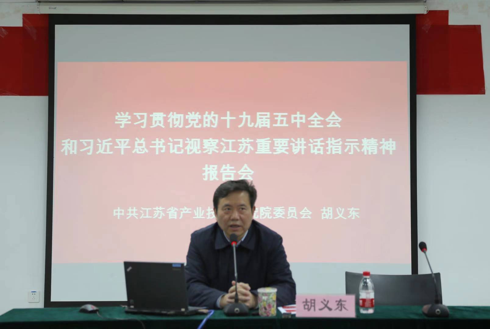 江苏省产业技术研究院党委书记胡义东在授牌活动后,做了《学习贯彻党的十九届五中全会精神和习近平总书记视察江苏重要讲话指示》专题报告,他对党的十九届五中全会的基本情况和《中共中央关于制定国民经济和社会发展第十四个五年规划和二〇三五年远景目标的建议》以及习近平总书记视察江苏重要讲话做了详细的传达,并对《建议》中与科技创新、产业升级等和江苏省产业技术研究院事业密切相关的重点内容进行了详细解读,并立足工作实际,与党员干部们分享了学习体会和认识,畅谈了江苏省产业技术研究院贯彻落实的基本考虑。