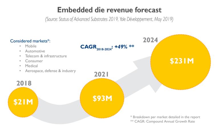 嵌入式芯片是市场上首款真正的基板堆叠技术,2018年市场规模大搞2100万美元,预计2024年将达到2.31亿美元,复合年增长率高达49%,成为先进基板平台增长最快的领域,是一项即将蓬勃发展的新兴技术。
